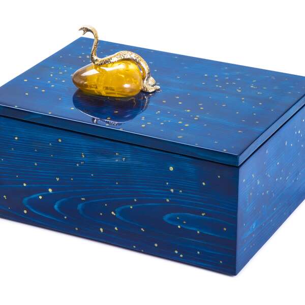 Blue lacquered box with corner protections in bronze, the lid featuring a resin pebble with a gold-plated snake. The box is devided into 3 compartments in the inside.