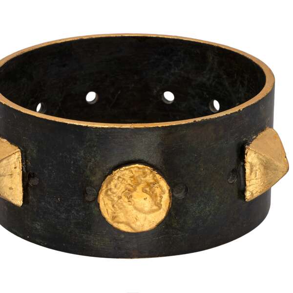 A bronze bowl with a black patina, adorned with gold-plated spikes and decorative coins, combining strength and elegance in a striking design
