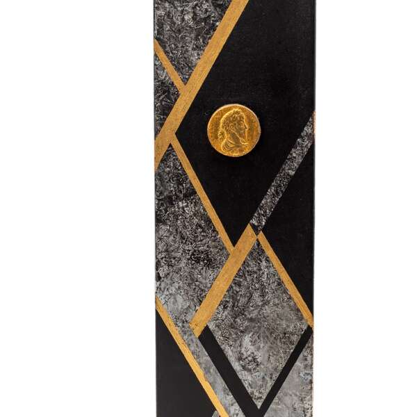 Unique, hand‑painted steel vase by Iranian artist Negin Fallah featuring a rich gold patina and a bronze coin detail.