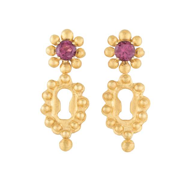 The earrings are of Silver, gold plated, and designed with small rounded bead-like details. Each earring features 2 purple gemstone at the top, set in a flower-like cluster of gold beads, creating a delicate and ornate look. The overall style is elegant and traditional, with a touch of vibrancy from the purple stones. 925 Sterling Silver Weight: 40.9 grams (total) Gemstones: 2 Garnets