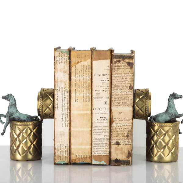 Set of two sculptural book holders featuring emerging horse or unicorn figures, crafted in bronze with a refined patina finish