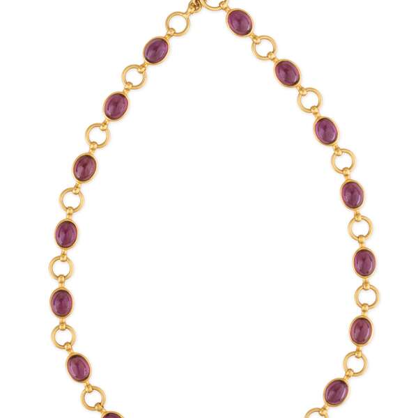 This is a delicate gold 21k necklace featuring oval-shaped rhodolite gemstones. The necklace is composed of evenly spaced, bezel-set deep pinkish-purple 17 pcs rhodolites linked together with gold settings. Each gemstone is oval-cut and connected by small round gold links, creating a continuous, elegant chain. The piece closes with a gold toggle clasp, adding both function and style. Yellow gold 21k, 43.72g Rhodolites 46.55 ct