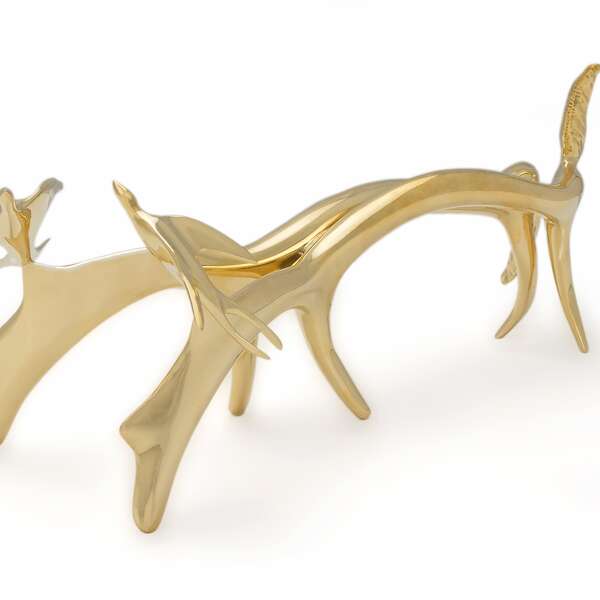 Bronze sculpture suggesting a gazelle, with two birds in a flying position