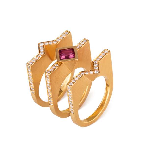 Designed by the architect Michel Chidiac This yellow gold 18k ring is composed of three interconnected gold rings. The edges of the design are accented with small diamonds, adding sparkle and elegance. At the center of one of the peaks, there is a rectangular-cut pink gemstone, which provides a vibrant focal point. The combination of geometric structure gives the ring a contemporary and luxurious appearance. Gold 18k, Weight Gold: 29.04 g Gemstones: Rhodolite 0.76 ct 94 Diamonds 0.82 ct Size - 50.5