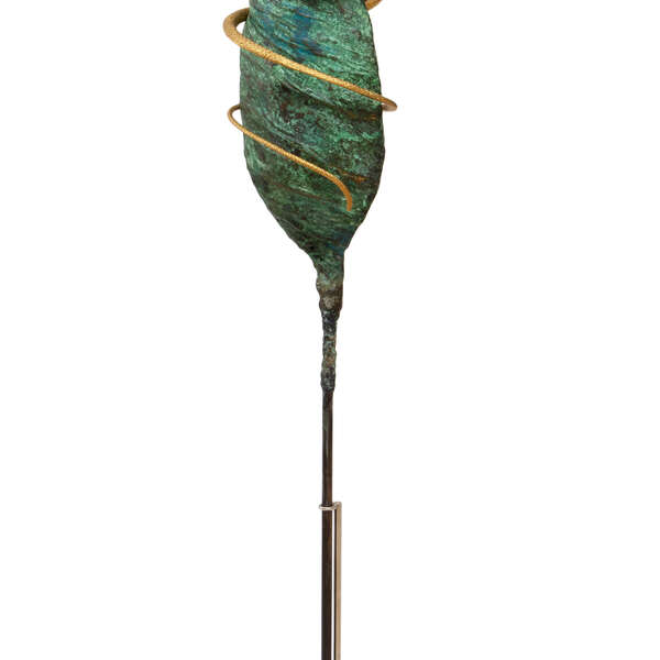 Green bronze patina lollipop sculpture on a stand surrounded by a bronze gold plated snake with 2 rubies and 1 emerald