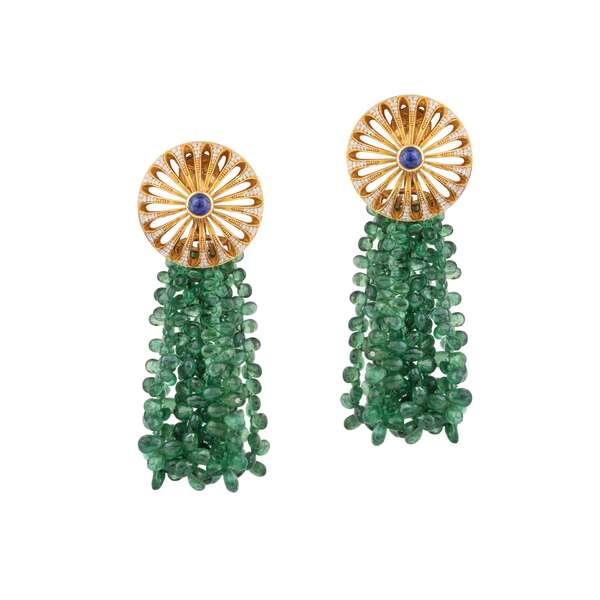 These are a pair of luxurious earrings featuring a refined blend of gold, gemstones, and vibrant 2 green briolettes. The combination of yellow gold, vivid green briolettes, and central 2 Saphyr cabochon,with diamond 1.18ct creates a bold yet elegant harmony of colors. Gold 21K, 25.68g Emeralds briolettes (90pcs per earring)