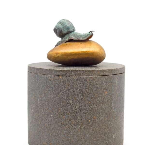 Ice bucket in grey marble with a bronze snail in patina and a bronze pebble as handle