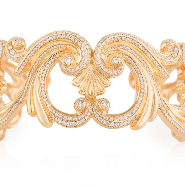 This is a luxurious bangle bracelet crafted in yellow gold with an ornate, sculptural design. The gold framework is richly embellished with rows of brilliant-cut diamonds, which trace the curves and swirls of the design, adding a radiant sparkle to every angle. At the center, a shell-like motif enhances the symmetry and elegance Yellow Gold, 18k, 55.89g Diamonds 5.550 ct