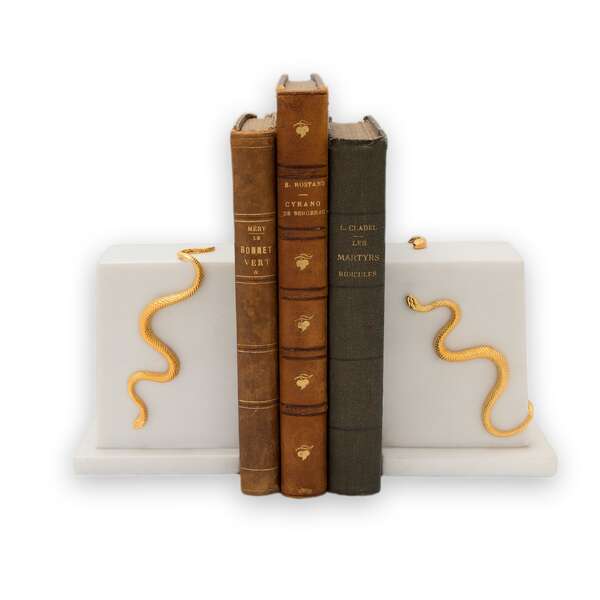 Book holders composed of solid white marble blocks, elegantly contrasted by a gold-plated bronze snake that coils gracefully around the structure.