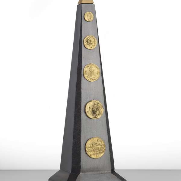 Sculpture in the form of an obelisk, made of cast iron and brushed steel. Five bronze coins are placed in front