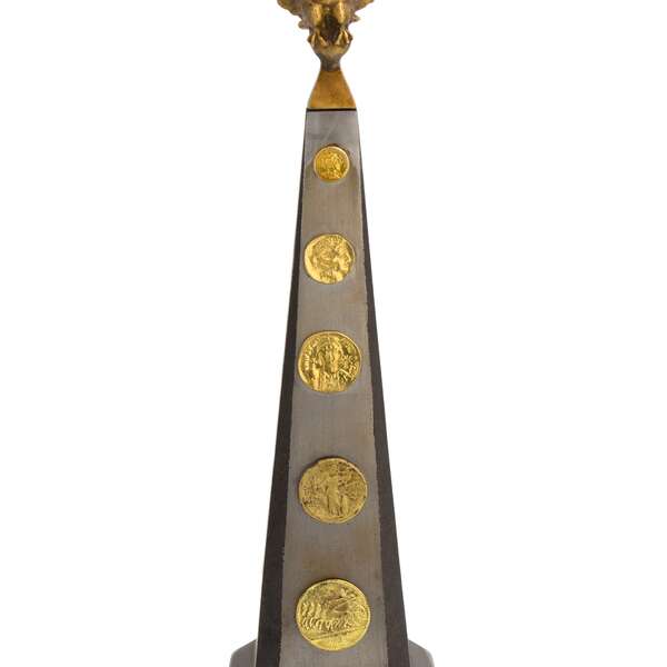 Sculpture in the form of an obelisk, made of cast iron and brushed steel. Five bronze coins are placed in front, with a bronze eagle mounted on top.