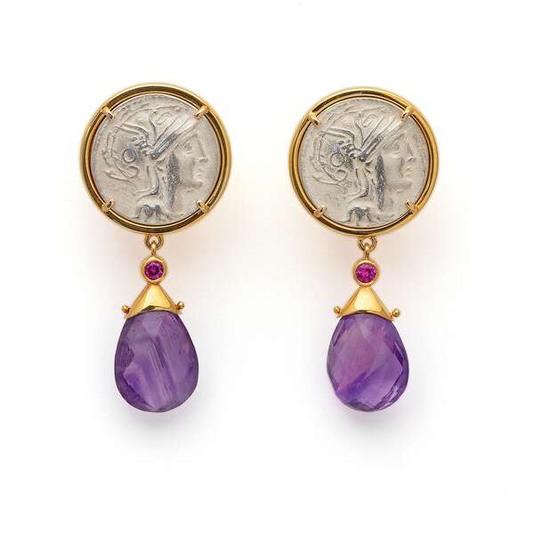 These are a pair of elegant earrings featuring an ancient coin-style design. At the top, each earring has a round silver-toned coin with a carved profile of a face, framed in gold. Beneath the coin is a small 2 rubis gemstone set in gold. Hanging at the bottom is a faceted teardrop-shaped with 2 amethysts in a rich purple color, also mounted in gold. The combination of antique coin detail, gold settings, and colorful gemstones gives the earrings a refined and classical look. Yellow gold, 18K, 9.06g 2 silver roman coins, 7g 2 Rubies 0.14 ct