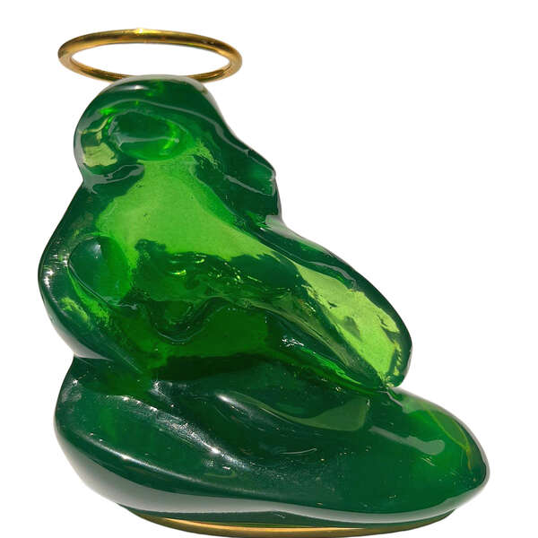 Small sculpture featuring a seated Virgin made of resin, with a gold-plated halo on an oval gold-plated base